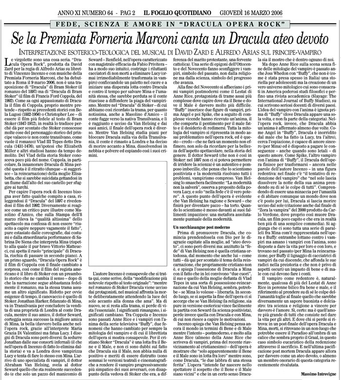 I corsivi sono una cosa seria. Dracula Opera Rock, prodotta da David Zard per la regia di Alfredo Arias su libretto di Vincenzo Incenzo e con musiche della Premiata Forneria Marconi, che ha debuttato a Roma il 9 marzo 2006, non è una trasposizione di Dracula di Bram Stoker (il romanzo del 1897) ma di Dracula di Bram Stoker (il film di Francis Ford Coppola, del 1992). Come sa ogni appassionato di Dracula il film di Coppola, proprio mentre pretende rispetto ai precedenti storici con Bela Lugosi (1882-1956) o Christopher Lee di essere il film più fedele al testo di Bram Stoker (1847-1912), in realtà lo tradisce perché dà per scontato che Stoker conoscesse molte cose del personaggio storico del principe valacco (e non conte transilvano, come vuole il romanzo) Vlad III Tepes detto Dracula (1431-1476), un’ipotesi che Elizabeth Miller e altri studiosi hanno da tempo demolito. Del Vlad della storia Stoker conosceva poco più del nome. Coppola, in particolare, fa innamorare Dracula di Mina perché questa è il ritratto (dunque si suggerisce la reincarnazione) della moglie Elisabetta, che si sarebbe suicidata gettandosi in un fiume dall’alto del suo castello per sfuggire ai Turchi.