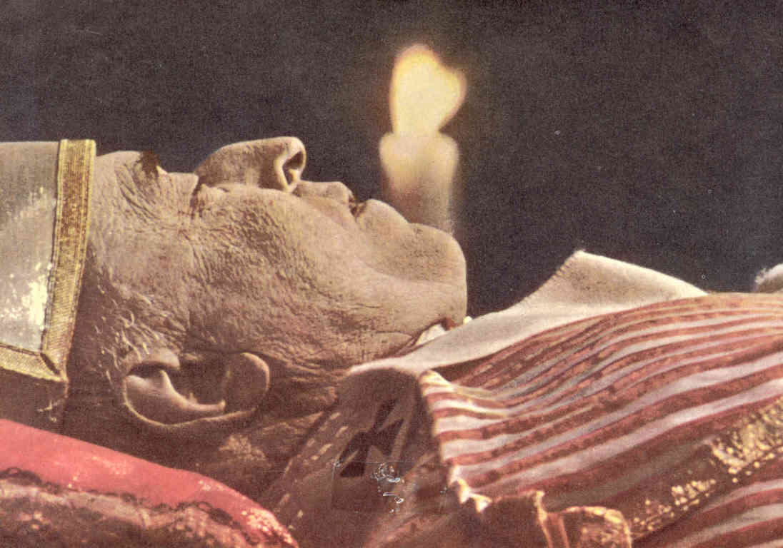 8 Riesumazione di papa Pio IX nel 1956. In realtà dovrebbe essere la terza e non la prima esumazione, e anche la bara deve essere stata aperta già due volte: nel 1883 e negli anni '30, ma non ufficialmente. Così si potrebbe spiegare l'annerimento della ormai mummia, a causa degli agenti atmosferici penetrati nella cassa dopo le due aperture.