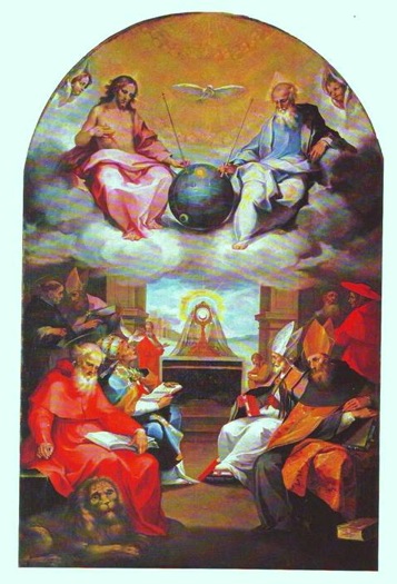 Ed è perciò che essa, proprio perché racchiude in sé l’intera dimensione escatologica, non può che essere vista come segno visibile e tangibile di una realtà superiore. I dotti della Chiesa, nell’affresco, contemplano il mistero, riconoscendo in esso non solo una fonte di fede, ma anche di razionalità, e intravedendone, per così dire, sulla verticale teologica, lo Spirito Santo effuso dal Padre, il quale santifica nelle mani del sacerdote il Dono di salvezza; è nella Sua era che l’Eucarestia conduce gli uomini a Dio. La rivelazione, nel quadro di Salimbeni, è segnata come da un orologio dal moto di precessione degli equinozi. Anche il cosmo dunque, nella pittura del Salimbeni, partecipa della salvezza, governato da rigide leggi matematiche. La matematica, osservava Galileo, contemporaneo di Salimbeni, è l’alfabeto nel quale Dio ha scritto l’universo. Ciò equivale a dire che la matematica è essa stessa logos divino, e tale concezione ben spiega, in definitiva, la rappresentazione astronomica di Ventura Salimbeni (che pure conserva una concezione tolemaica del cosmo). Come scriveva San Paolo (Rm 8,22-23), «sappiamo bene infatti che tutta la creazione geme e soffre fino ad oggi nelle doglie del parto; essa non è la sola, ma anche noi, che possediamo le primizie dello Spirito, gemiamo interiormente aspettando l’adozione a figli, la redenzione del nostro corpo». Lo scienziato diviene così per certi aspetti simile al sacerdote; nei meandri della matematica e nello studio dell’astronomia egli coglie qualcosa della la realtà trascendente dell’Eucaristia, presenza e condivisione dell’amore divino che redime.